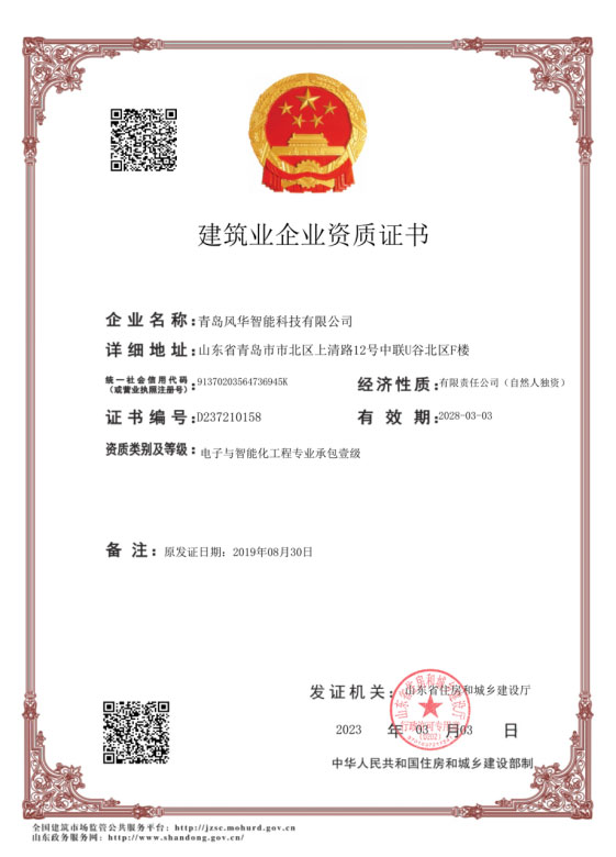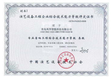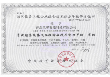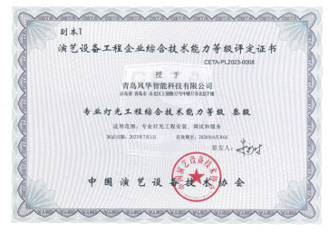 公司具备电子与智能化工程专业承包壹级资质、安全生产许可证、音视频系统集成能力贰级资质、专业音响系统工程设计及施工壹级资质、专业灯光系统工程设计及施工壹级资质、专业舞台工程设计及施工叁级资质等多项行业资质。公司拥有管理、营销、研发、项目实施及售后服务团队,保障多业务系统稳定运转。