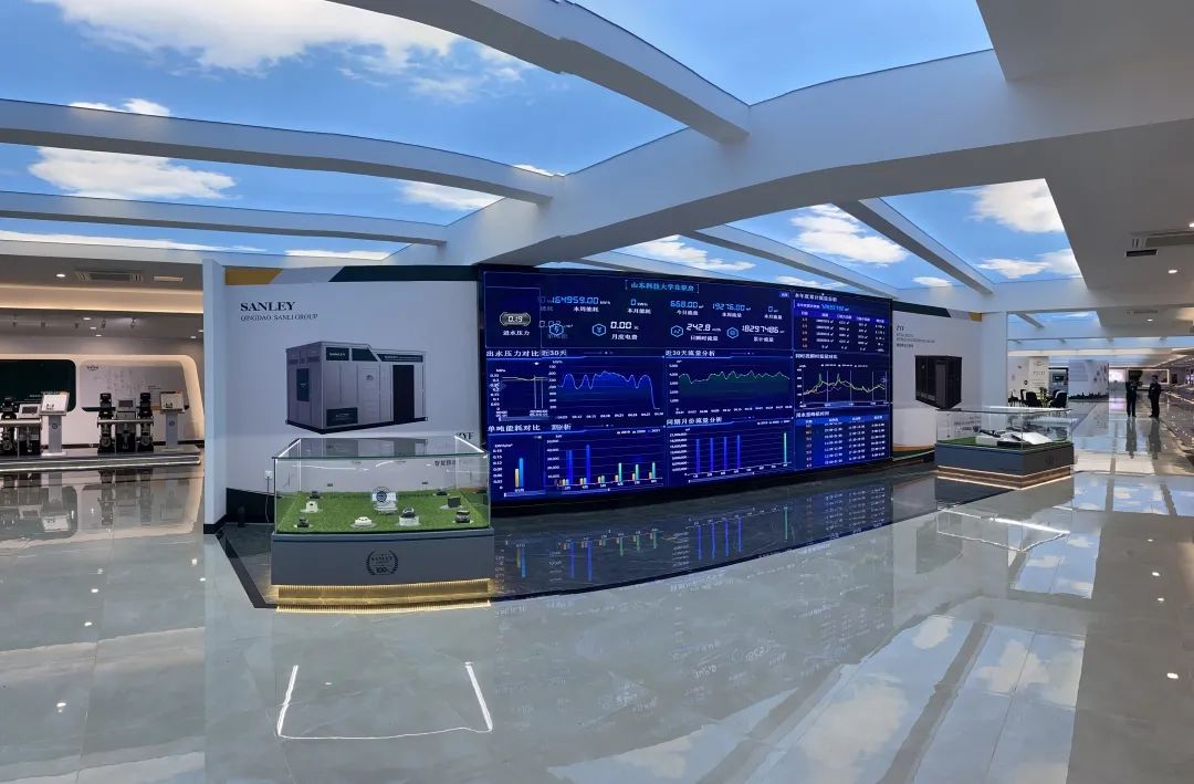 沉浸式产品体验:多屏联动展示三利无负压供水设备、智能水泵、智慧水务解决方案,支持3D 交互演示、工况模拟、数据可视化