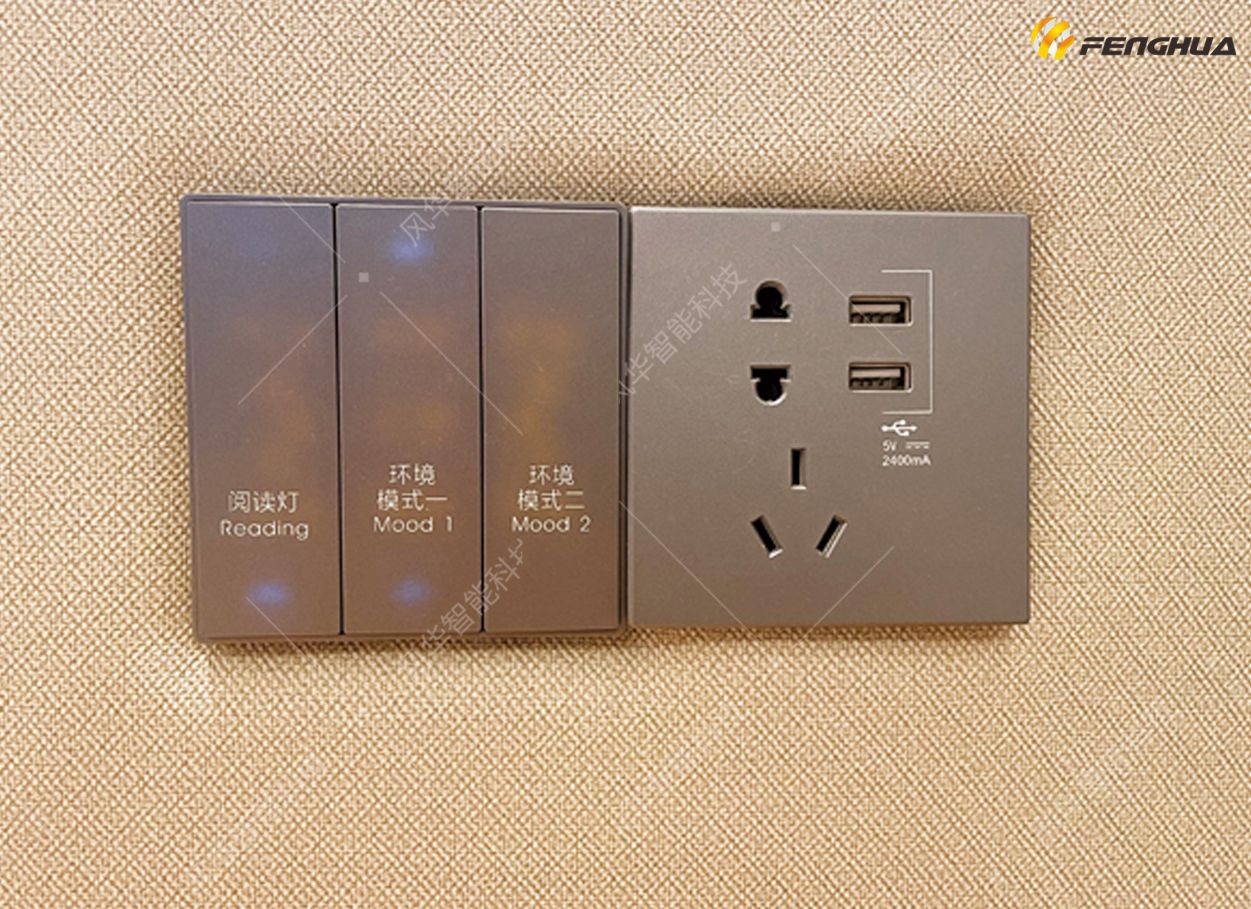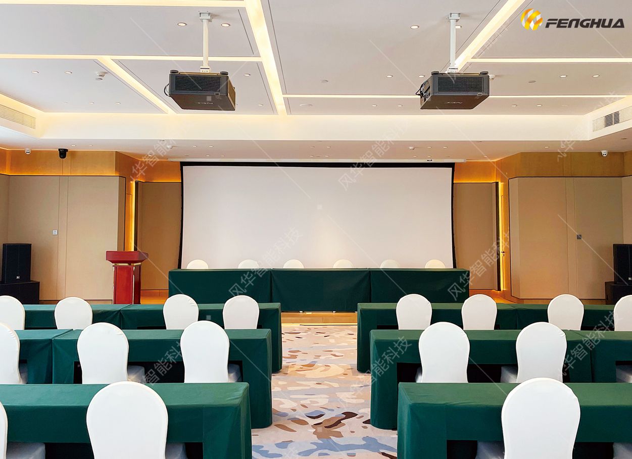 本次风华承接酒店公共会议厅堂及客房整体智能化项目,主要包括音视频系统及智能客房系统。其中智能客房系统采用互联网+酒店模式设计,实现了客人办理入住后,通过刷脸、微信公众号客控平台,或点击接收到的短信链接后将自动获得房门授权,入住时,只需手机轻松一点,无需房卡秒开门。客人进入房间后,系统立即打开欢迎模式(灯光窗帘自动打开至客人常用模式,空调调节至客人舒适的温湿度),客房内的空调设备、灯光照明设备、窗帘等设备均可以通过客房内的语音音响和手机实现智能控制;同时酒店运营人员亦可通过网络对空调、灯光的参数进行修改,不需要进入客房,远程开/关每间客房预先设定的场景。