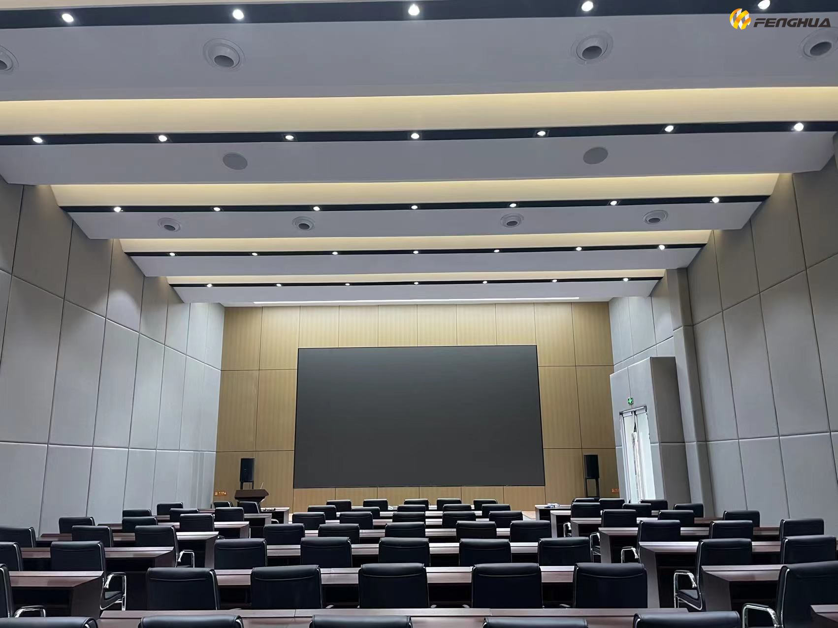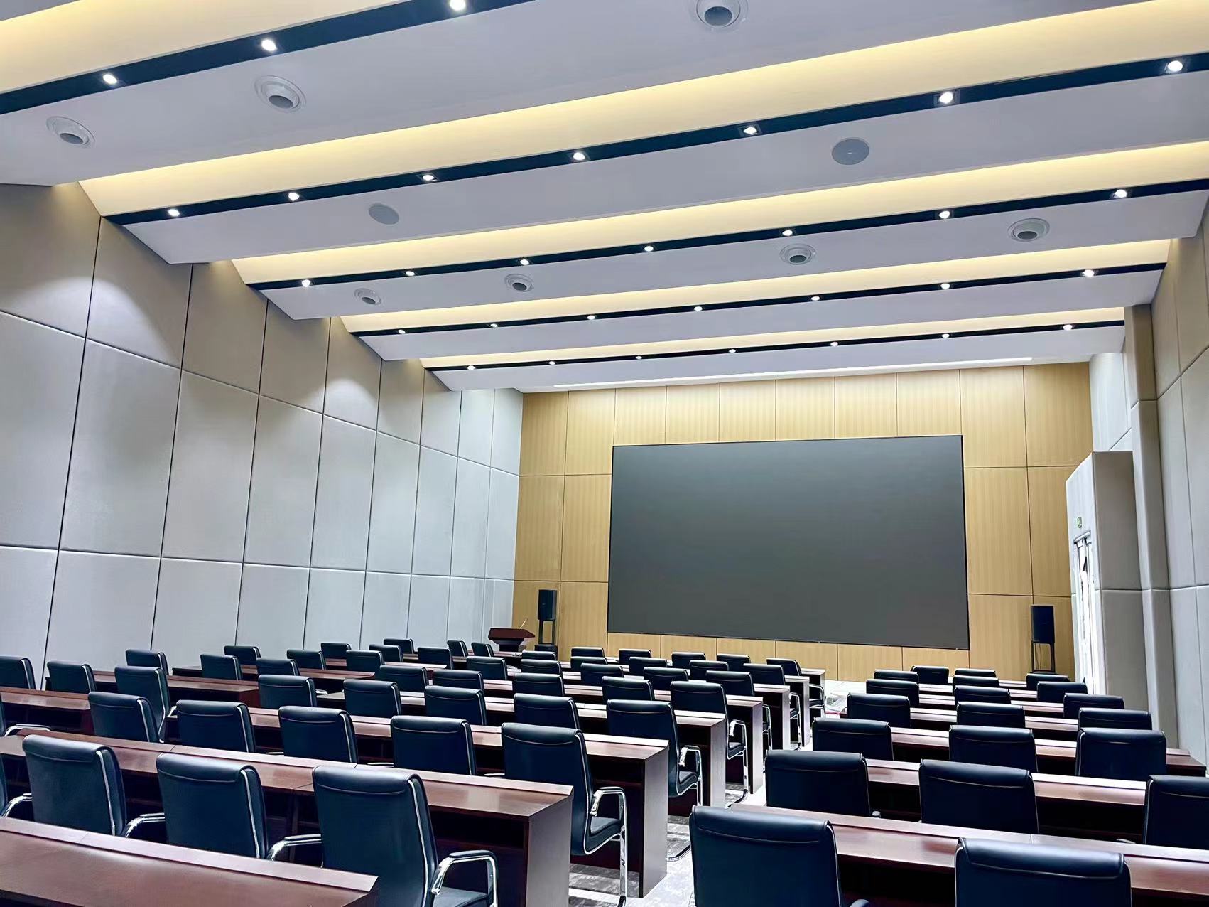 报告厅主要用于满足多类型活动的使用,包括演讲培训、圆桌讨论、集团大会;在保持原装修不变的情况下,此次风华进行了专业的声学设计。