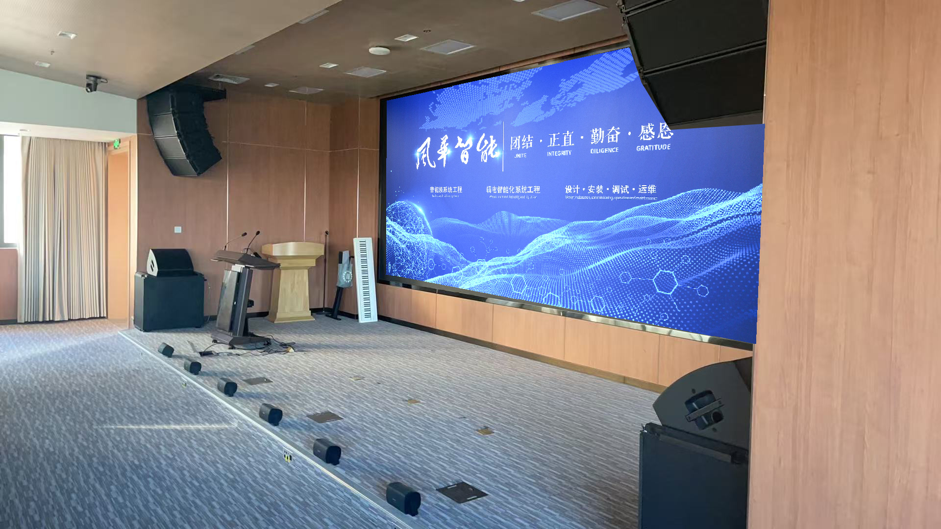 会议室/学术报告厅综合智能化系统,是适配现代高校、政府机构、企事业单位核心公共空间的集成化弱电解决方案。系统以“高效协同、智能管控、沉浸式体验”为核心,融合专业扩声、高清视频显示、智能发言、录播直播、远程视频会议、集中控制及环境联动等核心功能,打破传统会议空间局限,可满足从小型圆桌研讨到大型学术报告的全场景使用需求。其核心依托数字化技术与标准化集成架构,整合线阵列音箱、数字音频处理器、高清LED大屏等关键设备,实现音视频信号高效传输、设备集中管控与场景灵活切换。相较于普通办公系统,它更注重大空间声场均匀性、视讯稳定性与跨地域协作能力,兼顾实用与专业,既能保障日常会议高效开展,也能支撑大型学术交流、典礼仪式等高标准活动,是现代办公与学术交流不可或缺的数字化基础设施。